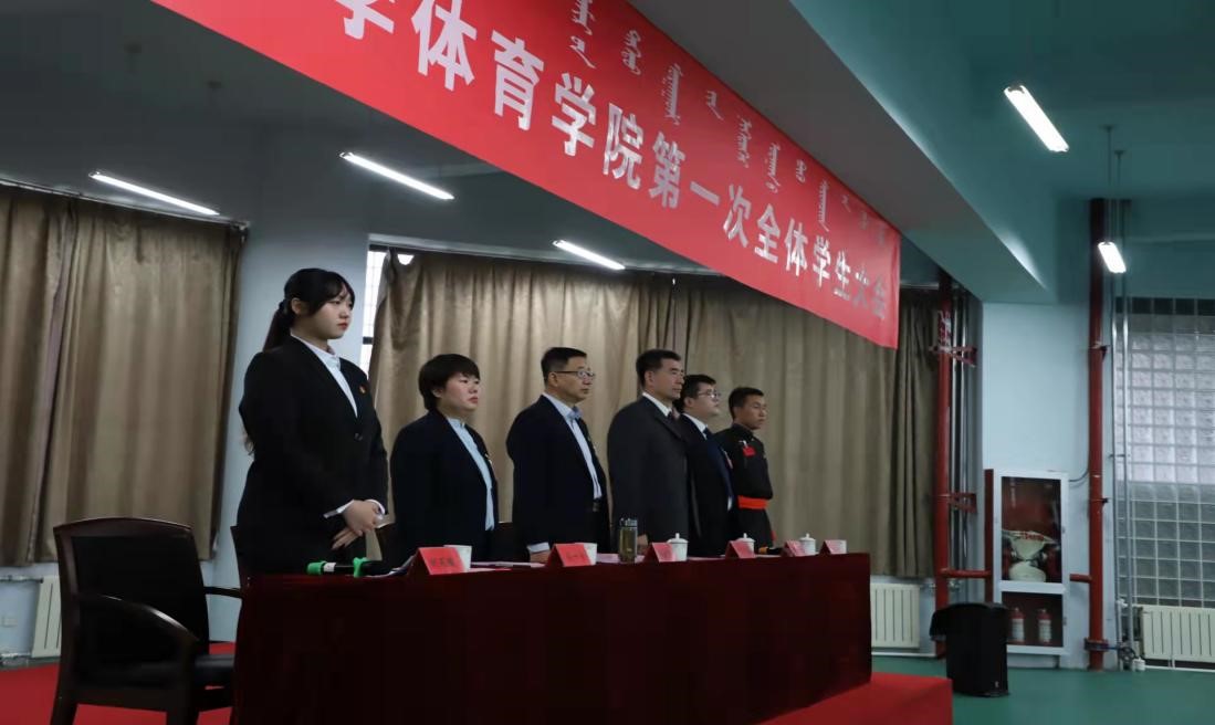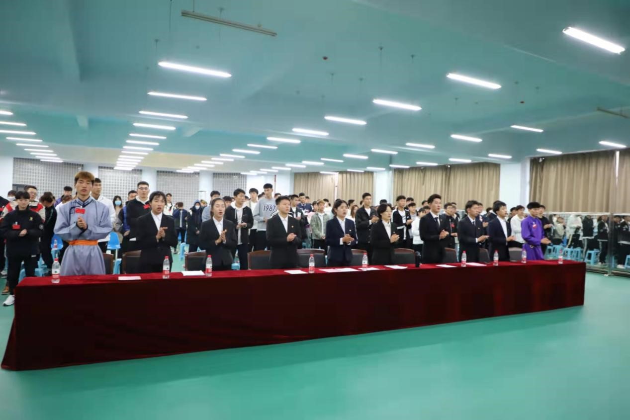 2021年10月9日上午9点,在体育馆一楼健美操室隆重召开了TYC234CC太阳成集团第一次全体学生大会。出席本次会议的人员有:TYC234CC太阳成集团党总支书记温毅刚,TYC234CC太阳成集团院长于志海教授,TYC234CC太阳成集团教务办副主任孙一宁,TYC234CC太阳成集团团总支负责人赵郑以及TYC234CC太阳成集团第三届学生会代表范查干。本次会议由第三届学生会执行主席明雨璇主持。2019级、2020级、2021级三个年级的同学共计147名学生参加了本次大会。