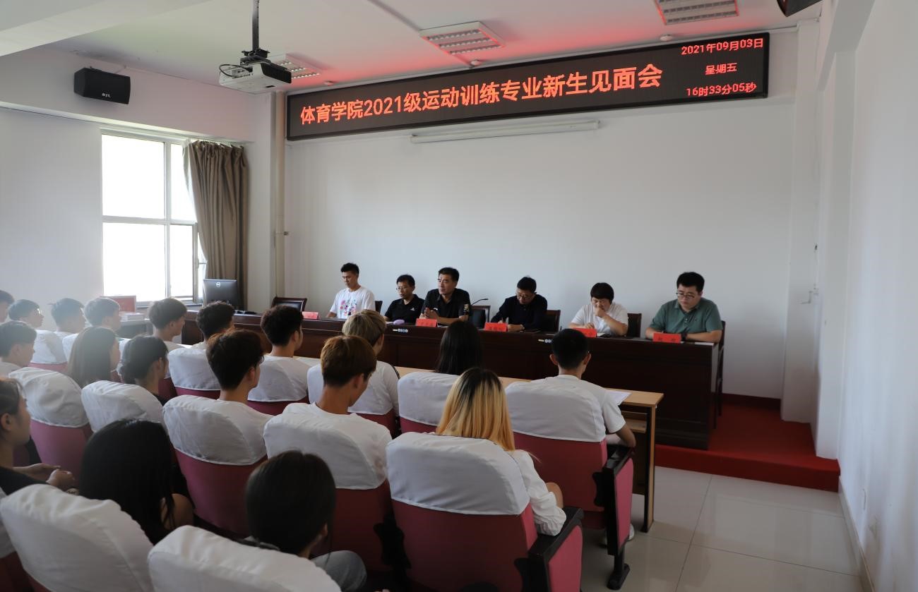 9月3日下午16点,TYC234CC太阳成集团在南校区体育馆举行了2021级新生见面会。学院党总支书记温毅刚、院长于志海以及办公室主任兼运动训练专业教研室主任孙吉旺、教务与科研办公室主任孙一宁、2021级运动训练专业班主任沈长明出席了大会。会议由赵郑主持,全体2021级新生参加了此次见面会。
