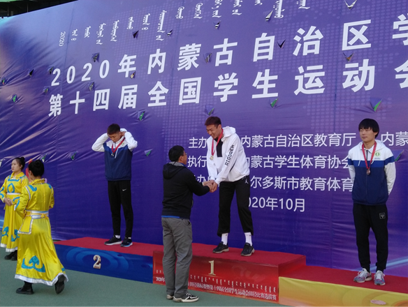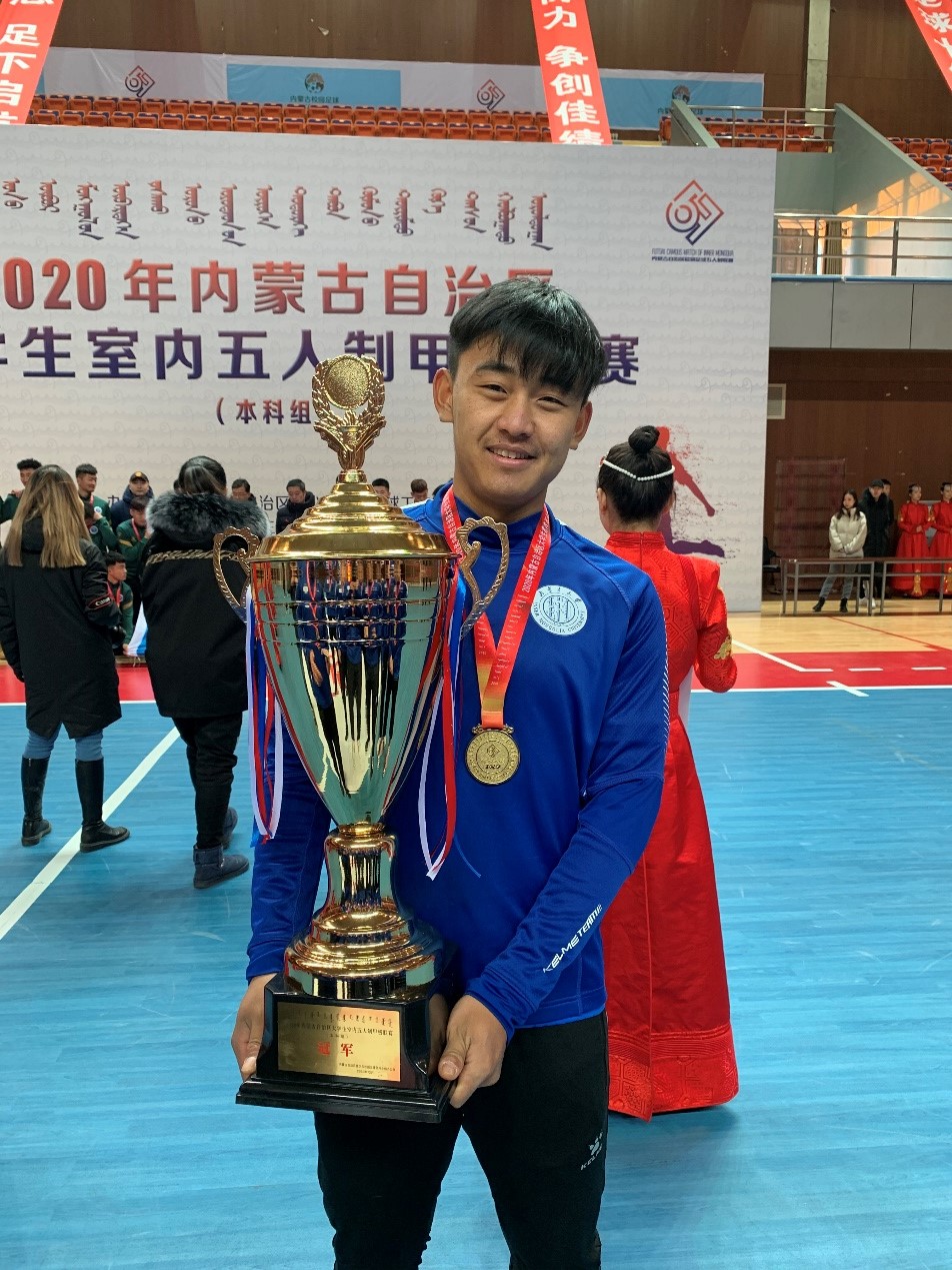 于2020年太阳集团主办内蒙古自治区大学生五人制足球赛中,通过教练员的指导,校领导的大力支持下,我校队员经过一星期的顽强拼搏,不惧受伤流血,秉承一个目标,齐心协力最终取得“内蒙古自治区大学室内生五人制甲级联赛赛”冠军的名次。在比赛与集训的过程中没有放弃学业,两边平衡,19学年平均绩点3.7,年级排名第4,体育成绩比较优秀,19学年正式成为太阳集团男子足球队超级组的队长。