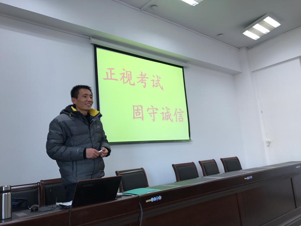 期末考试临近,全体学生进入备考阶段,2017级运动训练专业的同学们迎来步入大学第一次期末考试。我院召开考务会,班主任刘忠良老师召开“ 读书立品 诚信考试”主题班会,宣传考试期间诚信与考风考纪。