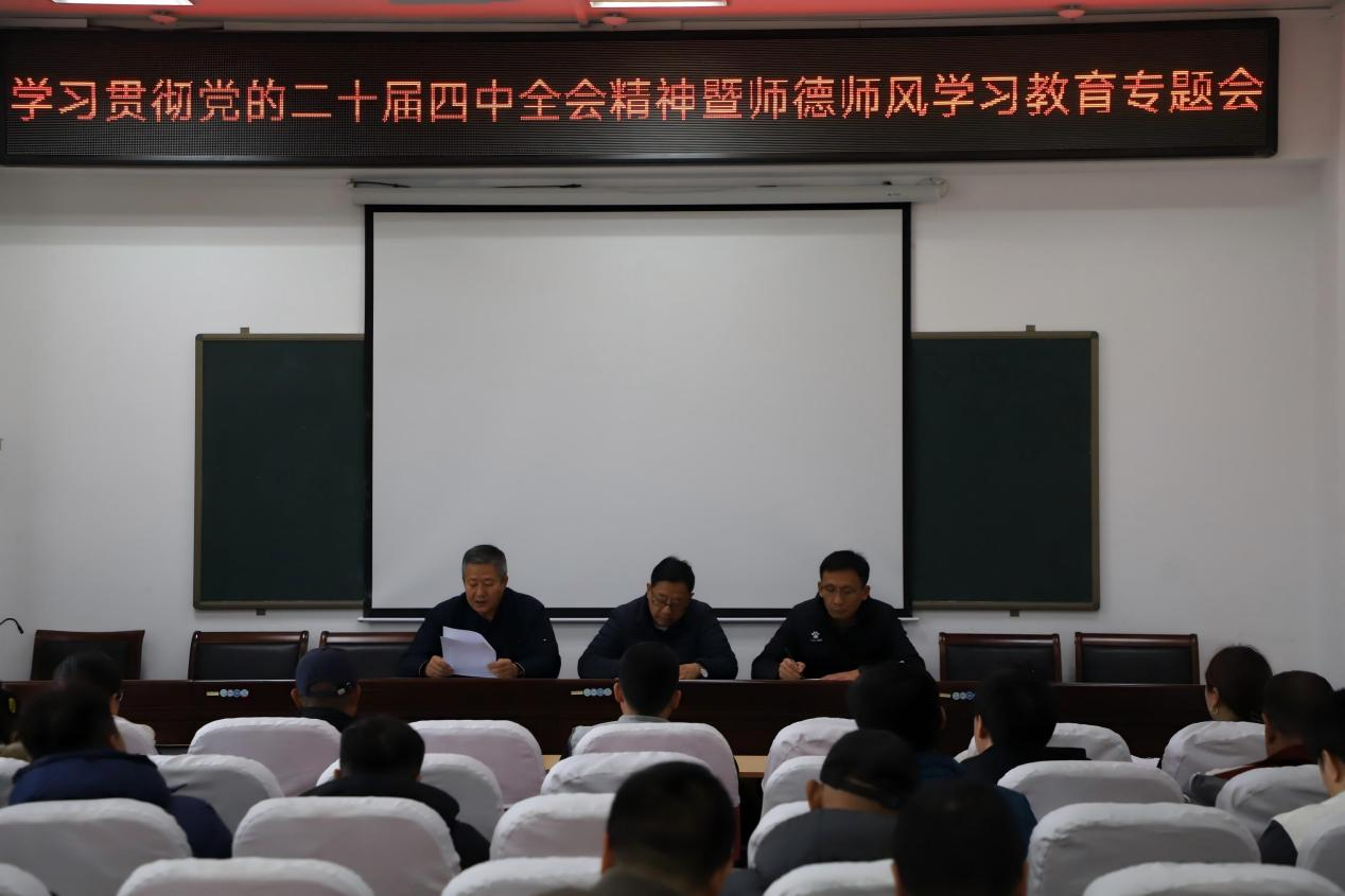 11月6日下午,TYC234CC太阳成集团在玉泉校区体育馆205室召开党的二十届四中全会精神暨新时代师德师风建设专题学习会。会议由学院党委书记温毅刚主持,全体教职工参加了学习会。会上,温毅刚书记对党的二十届四中全会精神进行了解读,刘忠良副书记领学了师德师风建设的有关规定和违反师德师风建设的典型案例。