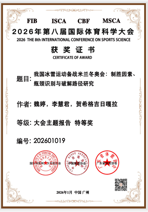 2026年1月2日至3日,第八届国际体育科学大会圆满落幕。本届大会由国际体育科学大会组委会、国际班迪联合会、国际体能协会、中国班迪协会、澳门体能协会联合主办,广东省体能协会承办,共收到来自全球的1400余篇学术论文,经严格评审后录用800余篇。我院魏婷副教授与李慧君副院长、贺希格吉日嘎拉教授组成的研究团队,携成果《我国冰雪运动备战米兰冬奥会的制胜因素、瓶颈破解和突破路径研究》受邀参会,魏婷副教授代表团队作主题报告,相关成果荣获大会特等奖。